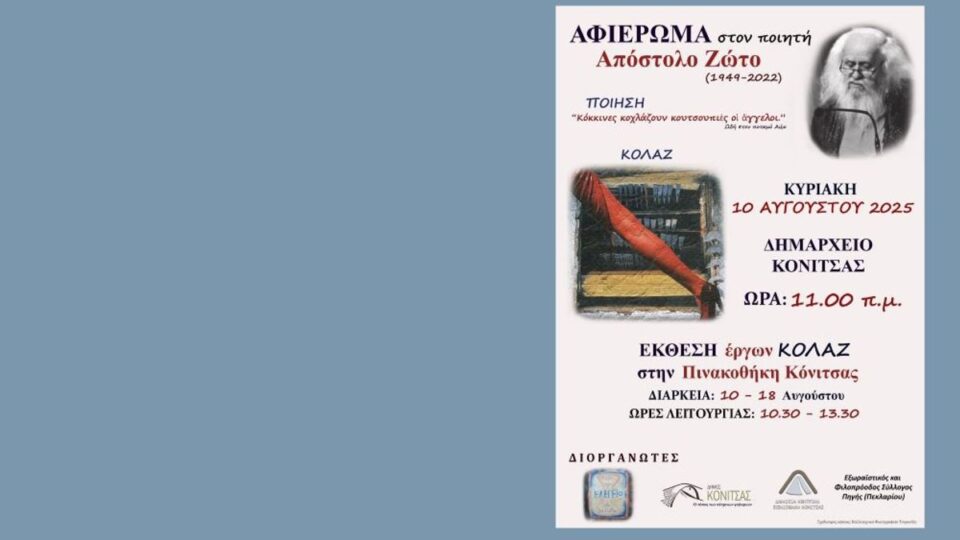 Η Κόνιτσα θα τιμήσει τη μνήμη και το πολυσχιδές έργο του ποιητή και εικαστικού Απόστολου Ζώτου (1949–2022) με μια ξεχωριστή εκδήλωση, η οποία θα πραγματοποιηθεί την Κυριακή 10 Αυγούστου 2025, στις 11:00 π.μ., στην αίθουσα εκδηλώσεων του Δημαρχείου Κόνιτσας. Αυτή η εκδήλωση αποτυπώνει τον φόρο τιμής σε έναν δημιουργό που άφησε σημαντική παρακαταθήκη στην ηπειρώτικη και ευρύτερη πνευματική ζωή, χάρη στη υπερρεαλιστική ποίηση και την εικαστική του δραστηριότητα, η οποία εστιάζει ιδιαίτερα στο κολάζ.